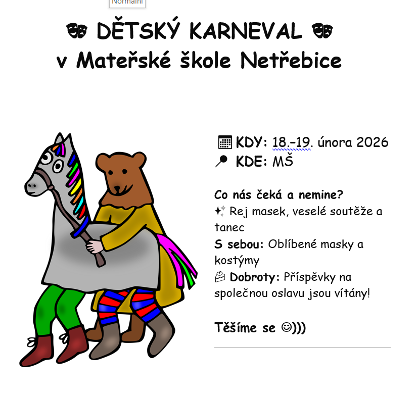 Dne 24.2.2021 nás čeká Karneval. Prosíme všechny zúčastněné, aby se dostavili v maskách. Maminkám děkujeme za pomoc s přípravou. Těšíme se o:))